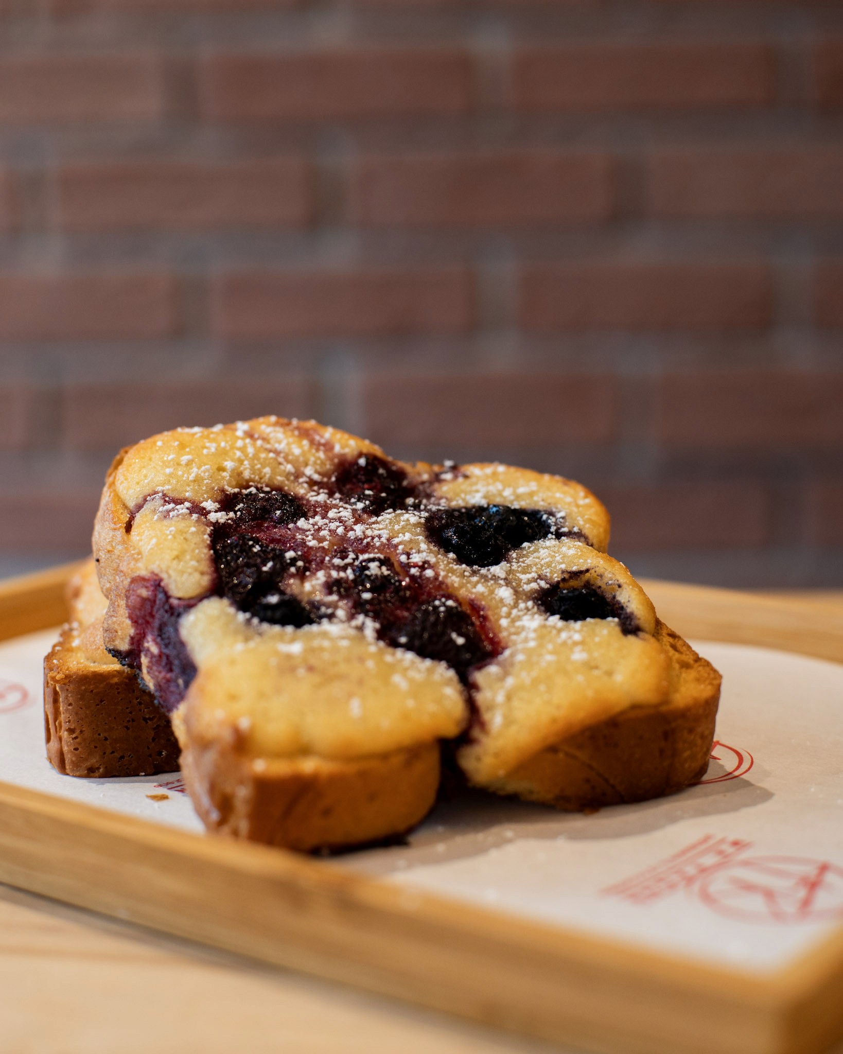 Sliced Brioche Soaked in a Citrus Glaze and Topped with Frangipane and Blueberries