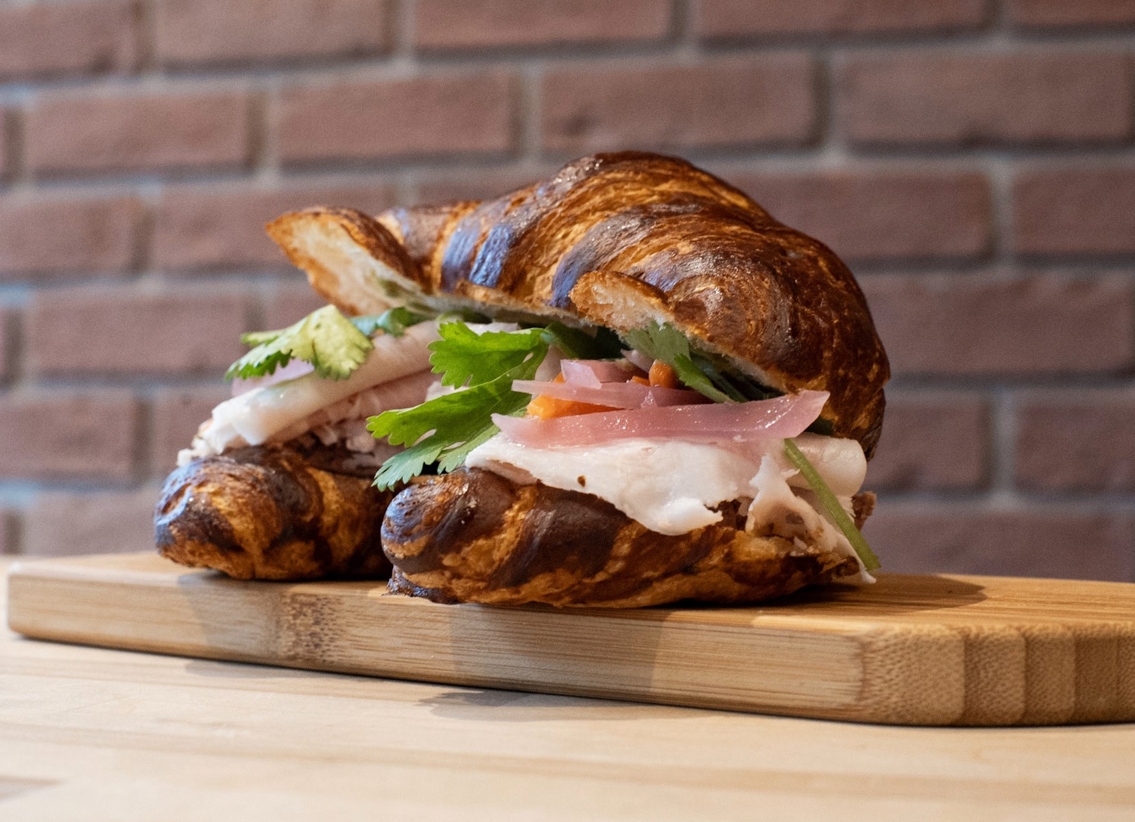 Proscuitto Cotto, Pate de Campagne, Pickled Carrots, Pickled Onions, Basil Aioli. Served on a Pretzel Croissant