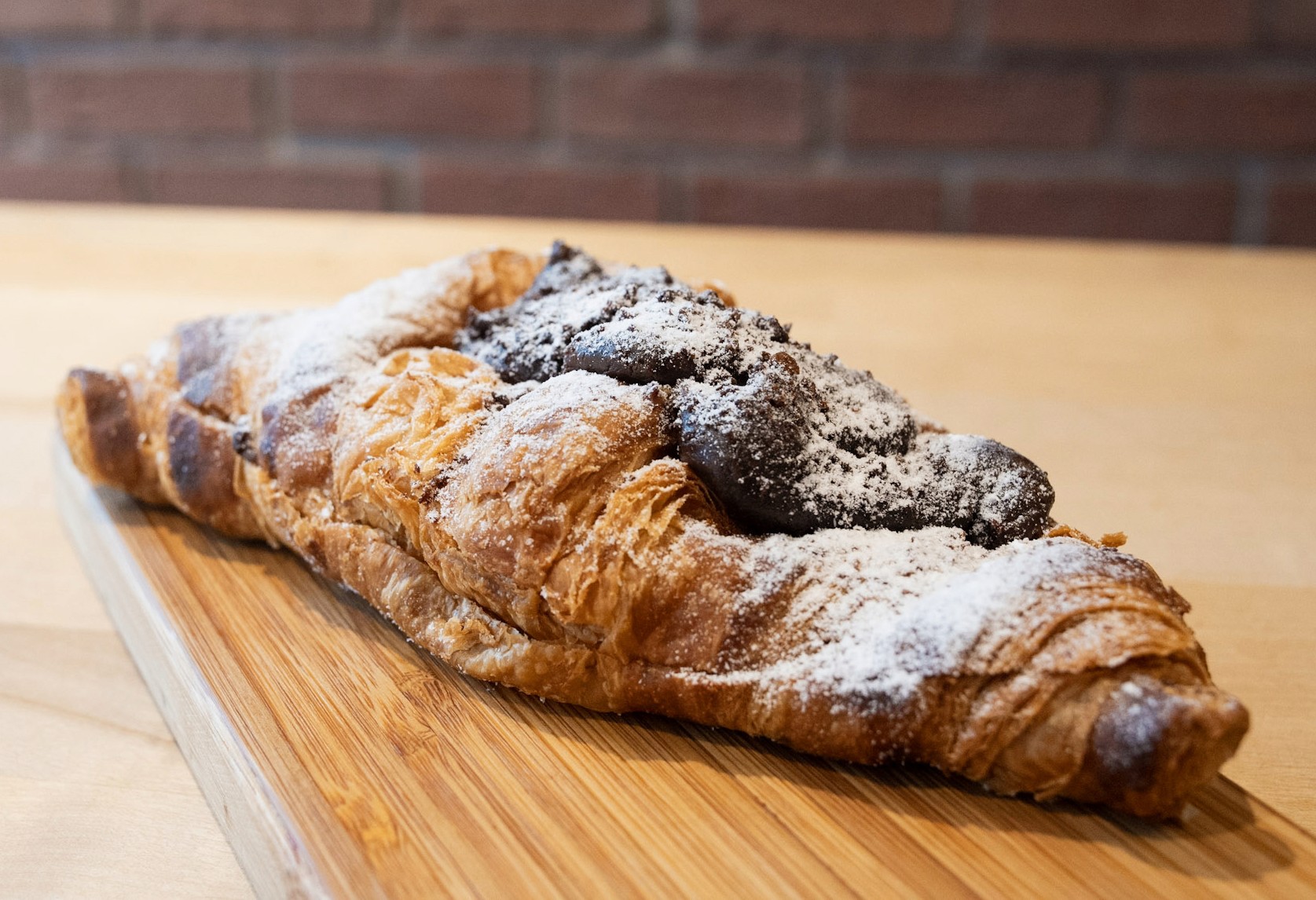 This Is Not Your Ordinary Chocolate Croissants with the Chocolate Stick In The Center. Ours Is Made With Chocolate Ganache Filling and Also Piped On Top with Chocoalate Streusal. Our Croissants Are House-made With European Butter and Multiple Layers of Lamination
